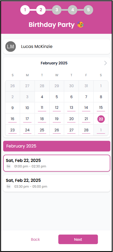 - The next screen, the parent will select the date/time they want to book based on the dates/times you made available in admin setting.