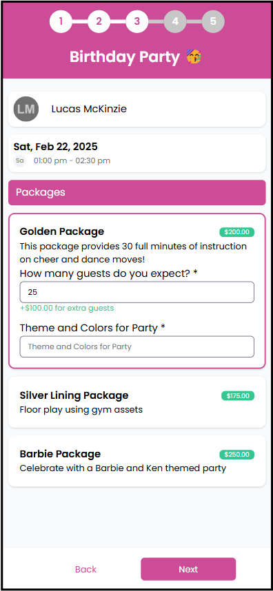 - Parents will select their package of choice and the amount of guests they are expecting. If they go over the guest amount the package covers, it will show how much it will cost for additional guests.
