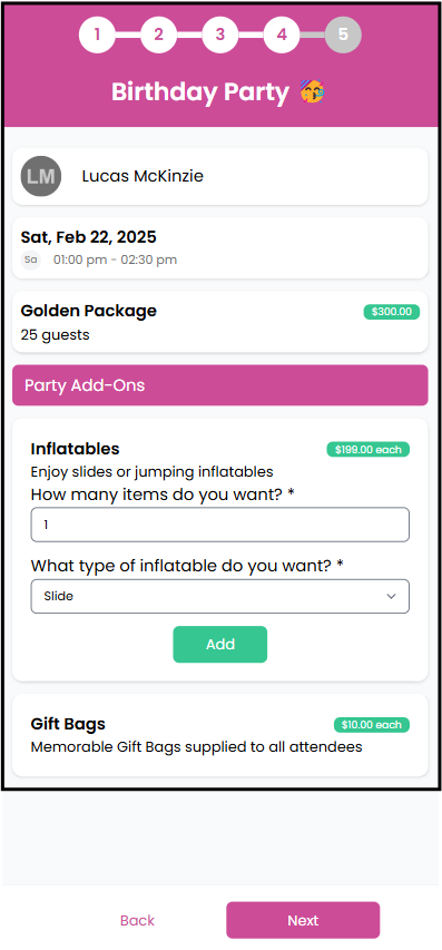 - Parents will choose if they want any party add-on's and how many.