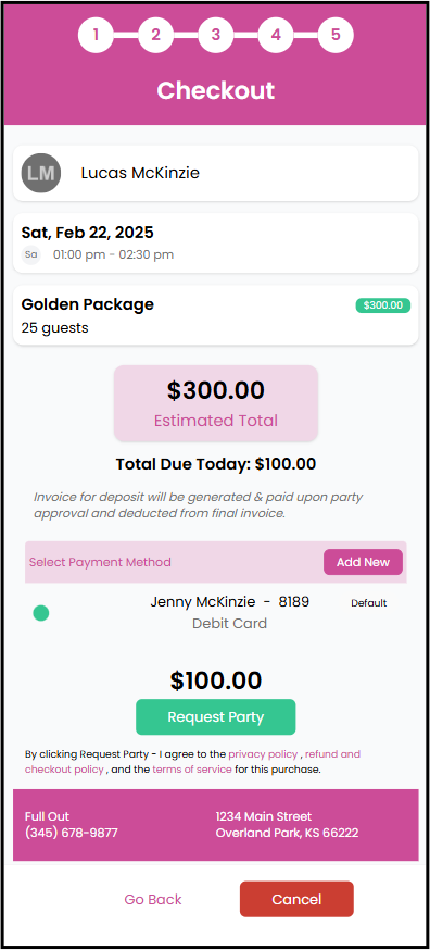 - On the checkout screen, parents will see the date and time of the party, party package, the "estimated" total, and the amount due upon booking the party. The amount due upon booking will show up if you have a deposit required.