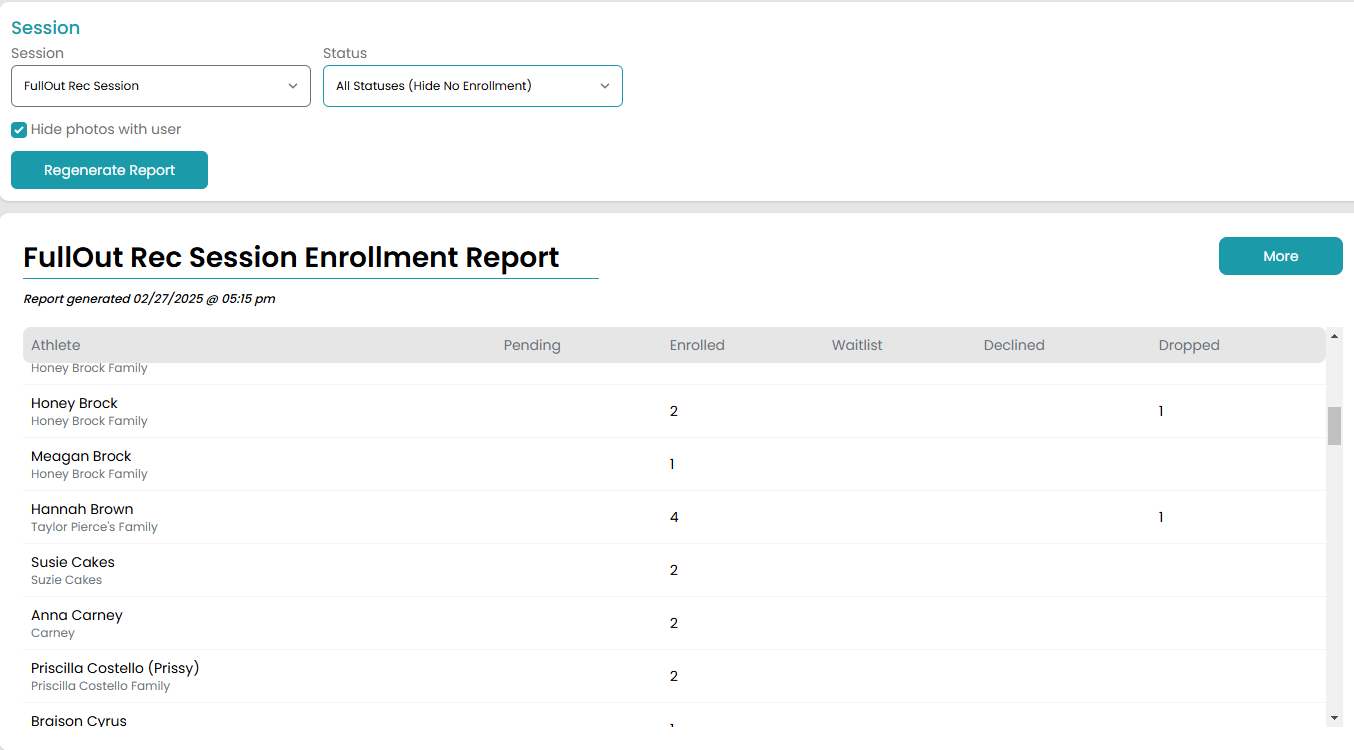 The rec enrollment status report gives a breakout of rec session enrollment statuses per athlete. Athlete's are listed with the count of various enrollment statuses for the specific rec session selected.