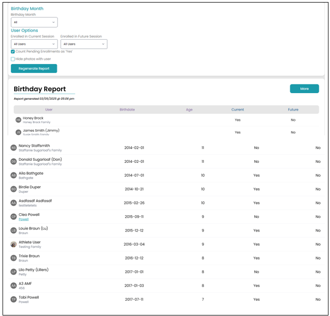 The birthday report gives the administration the information on the birthdate, age and enrollment status at the time the report is generated, of each athlete. This report can be filtered to a specific month or optional enrollment status for the athletes. This report is useful for the business to understand at a glance how many athletes of each age are members of the business, or provide all athletes with birthdays in a specific month for recognition.