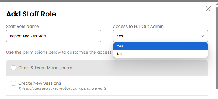 On the Add Staff Role modal, first define the staff role name, which should be unique and descriptive, for instance "Session Reports Staff" could give permissions to view and print the role sheets for all classes. The next option that is needed is "Access to Full Out Admin". This must be set to Yes for the permissions to apply. This setting allows the staff user to log in to the Admin portal, where they can access the features that are permitted.